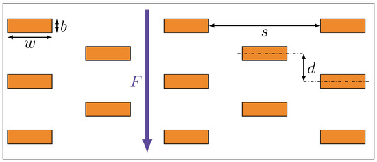 As can be seen in Equation (13), only two parameters, the aspect ratio and the filler volume fraction , are used in the Nielsen model. For numerical simulations, additional parameters are necessary to sufficiently describe the geometric structure of the permeation problem. For the Nielsen model, the fillers are arranged in a regular pattern: rows of rectangular fillers with the longer edge perpendicular to the direction of diffusion, each row offset from the previous one so that the fillers are in the middle of the gaps of the previous row. Therefore, only two more parameters are needed to fully describe the geometric structure: the slit distance s, which defines the width of the gap in a row, and the filler distance d, which defines the distance between the symmetry axes of two adjacent rows (see Figure 2).