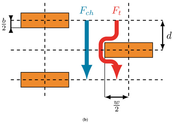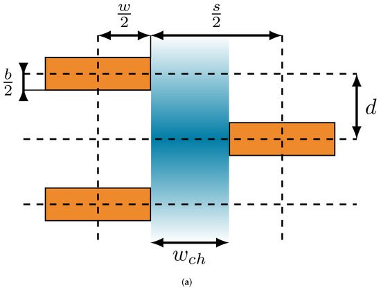 According to Equation (17), the filler distance is also dependent on the slit distance s, which is calculated by calculating the ratio between the superposition of the two flows and and a flow that represents unhindered permeation in an unfilled polymer matrix, inside two consecutive unit cells (see Figure 3). Since the channels pass through the polymer matrix without interruption, provided that the fillers are arranged regularly and periodically, the flow is unhindered for the whole thickness of the membrane. Therefore, the fraction of unhindered flow in the membrane is only dependent on the width of the channels , which is calculated with