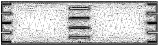 To verify that the channel model gives reasonable results according to the assumptions of the Nielsen model, 2D geometries of filled polymer matrices were generated in which the fillers were regularly and periodically arranged. The 2D geometries were created and meshed with the free software SALOME [34], using Python macros to generate the filler arrangements. The area size of the geometry depended on the filler width w, the slit distance s, and the filler distance d, since each filler array contained exactly 100 filler rows with one filler each. The fillers were arranged periodically in each row, so that the slit distance spacings between fillers and the fillers cut off at one boundary parallel to the diffusion direction were continued at the opposite boundary. The definition of periodic boundaries also allowed a very small number of fillers per row and thus significant savings in computational power without compromising the accuracy of the simulations (see Figure 4, for example).