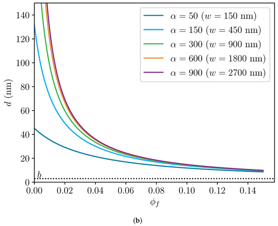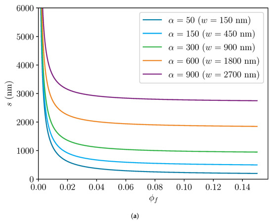 Figure 6 displays the results the channel model for slit distance s and filler distance d as a function of the filler volume fraction according to the predictions of the Nielsen model in Figure 5. After a sharp decline below , the decrease in the slit distance s reduces strongly until it falls below the respective filler width w at , independent of the aspect ratio . In contrast, the filler distance d approaches a finite value at . After substituting Equation (25) into Equation (17), this finite value, which seems to be caused by the fast approach of Equation (25) to infinity, can be approximated with good accuracy by