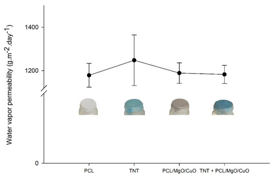 According to Figure 5, it can be observed that PCL, PCL/MgO/CuO and TNT + PCL/MgO/CuO samples present similar values, such as 1167.97 ± 45.66, 1178.66 ± 35.78 and 1174.48 ± 33.98 g·m−2·day−1 without statistical differences (p > 0.05). The notable oscillations on commercial TNT sample values (1226.74 ± 101.06 g·m−2·day−1) can be related to: (i) the big pore-size consequence of the large fibers’ diameters (~24 µm), and (ii) to the morphology heterogeneity consequence of the common industrial process used. In fact, reducing the fiber diameters does not compromise the WVP of the structure, since the values are not statistically significant compared to the commercial TNT.