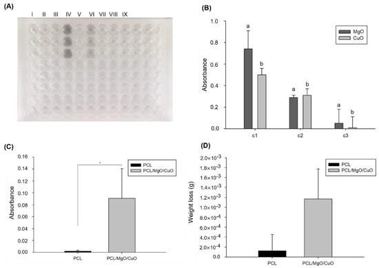 Stability test during washing process of electrospun filters. (A) 96-well plate used in the spectrophotometry assay for metal oxide NPs released quantification (I—control; II—PCL mesh; III—PCL/MgO/CuO; IV—CuO 100%; V—MgO 100%; VI—CuO 50%; VII—MgO 50%; VIII—CuO 1%; IX—MgO 1%); (B) Absorbance representing 100% (c1), 50% (c2), and 1% (c3) of the total amount of nanoparticles (measured at 400 nm); (C) Absorbance of the aqueous medium for 2 h of washing (measured at 400 nm); (D) Weight loss during washing process. Differences between conditions were evaluated all pairwise using Tukey’s test. Bars with the same letters have statistically significant differences (p > 0.05). Statistical significance for p ≤ 0.05 (*).