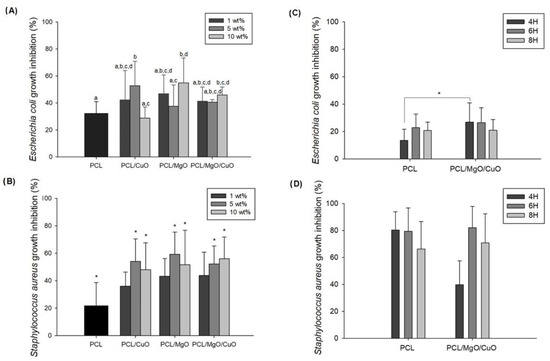 In Figure 7C, the antibacterial activity against E. coli was not linear over time. In fact, after 4 h of contact, bacterial growth inhibition was 26.94 ± 13.96% and after 6 h the inhibitory activity decreased from 26.50 ± 10.81 to 20.03 ± 7.80%. Comparing the PCL and PCL/MgO/CuO electrospun meshes over the time, the inhibitory activity was noticed only for 4 h of contact (p ≤ 0.05). The same trend was observed for PCL electrospun meshes coated with silver nanoparticles (AgNPs) that showed excellent antibacterial action against E. coli in 4 h, suggesting that after 4 h some growth mechanism is disrupted in this strain, inhibiting the bacteria activity [50].