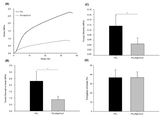 Mechanical characterization of PCL electrospun meshes (black) and PCL electrospun meshes dopped with MgO and CuO NPs (grey). (A) stress–strain representative curves; (B) Young’s Modulus; (C) tensile strength at break; and (D) elongation at break. Statistical significance for p ≤ 0.05 (*).