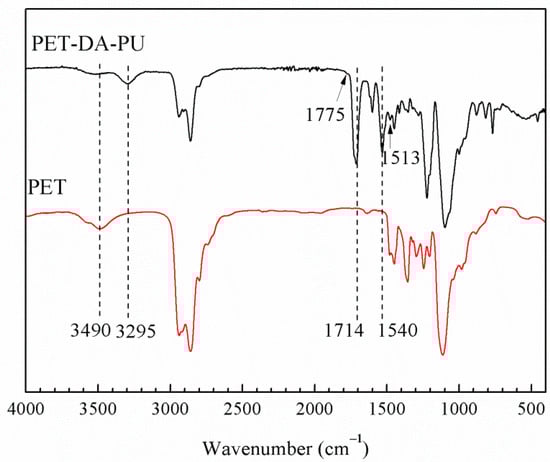 PET-DA-PU was synthesized via a prepolymer process of PET, using DA diol which prepared though cycloaddition reaction as chain extender, and TDI as a curing agent, as demonstrated in Scheme 1 and Scheme 2. The chemical structure of as-synthesized PET-DA-PU was first investigated by ATR-FTIR (as shown in Figure 1). In the ATR-FTIR of PET-DA-PU, the shoulder peaks at 1775 and 1513 cm−1 specific were due to the characteristic absorption of DA ring on PET-DA-PU []. The peak at 1107 cm−1 is ascribed to the characteristic absorption of C–O from PET. As compared to PET, the intensity decreases in –OH peak (3490 cm−1) of PET and the absence of adsorption peak at around 2270 cm−1 indicated that there were no residual hydroxyl and isocyanate groups in PET-DA-PU. It is worth noting the additional peaks at 3295, 1714 and 1540 cm−1 which were due to the –NH stretching vibration, –C=O band and –N–H stretching bands of the urethane group on PET-DA-PU, respectively []. Therefore, it could be confirmed that PET based polyurethane containing DA bonds had been synthesized successfully.