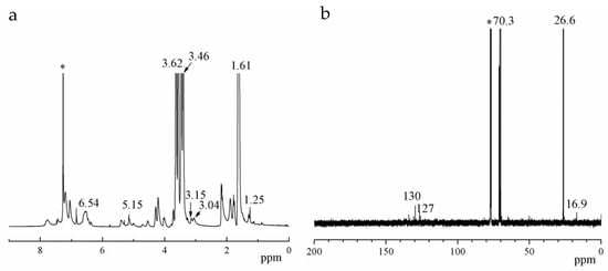 1H NMR (a) and 13C NMR (b) spectra of PET-DA-PU. (‘*’ for CDCl3).