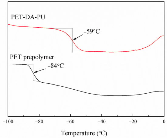 Glass transition temperature (Tg) is an important property of polymeric binders as it determines the application temperature range. In this study, DSC was used to investigate the Tg of PET-DA-PU, and the Tg was measured by the cooling DSC curves of the PET-DA-PU. As shown in Figure 3, in comparison of PET prepolymer (Tg = −84 °C), the PET-DA-PU showed a slightly higher Tg of −59 °C, which allows it to work in a low-temperature environment. It is due to the decrease in chain flexibility of PET as to the introduction of DA diol and TDI, and the formation of urethane group []. Moreover, PET-DA-PU exhibits only one Tg, which may be attribute to the fact that PET and TDI-extended DA diol segments are well-dispersed and blended within the films, thus the polyurethane consists of one phase. The same phenomenon was also observed in other literature [].