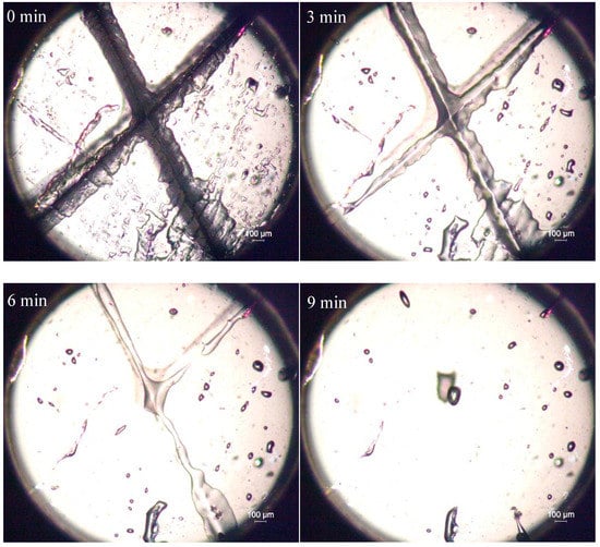 As shown in Figure 4, the width of the crack in PET-DA-PU film decreased clearly with the heat treatment time increasing, and the crack on the film had completely disappeared in 9 min []. The results indicated good self-healing properties of PET-DA-PU.