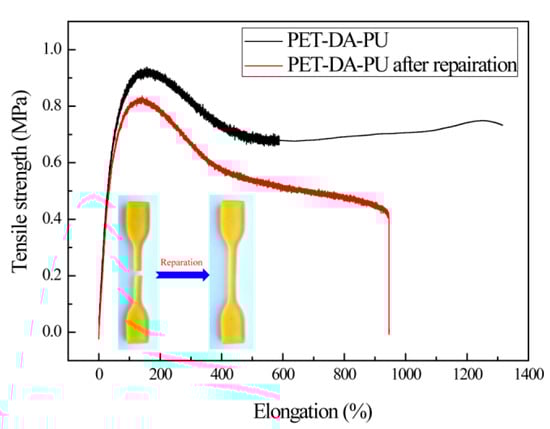 The healing efficiency of the PET-DA-PU was measured quantitatively by the universal testing machine []. The PET-DA-PU film samples were prepared and tested according to GB/T528-1998. The PET-DA-PU film was cut off by a thin knife, and the film was heated at 100 °C for 20 min, then cooled down to 60 °C and kept for 48 h, and the healed PET-DA-PU film was obtained. As shown in Figure 5, compared with the PET-DA-PU (the tensile strength was 0.92 MPa, with an elongation at 151.3%), the tensile strength of repaired PET-DA-PU was 0.82 MPa with an elongation at 137.5%. Thus, the healing efficiency of PET-DA-PU was 89.1%. The results reveal that the PET-DA-PU has a satisfactory healing efficiency.