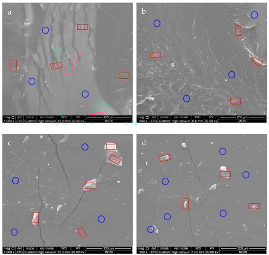 To investigate the rupture mechanism of PET-DA-PU in the tension process, the fracture morphologies of the PET-DA-PU films which were prepared by freeze-fractured and tensile-fractured were studied by SEM. As shown in Figure 6a,b, the wrinkles are marked by red restangular frames representative of aggregated hard segments, and the ravines are marked by blue circle frames representative of non-homogeneous soft segments. Clearly, the phase separation exists between the soft and hard segments and is well dispersed within the whole vision [,,,]. However, the hard segments (marked as red rectangular frames) in tension-fractured PET-DA-PU film display aggregated as blocky shapes in Figure 6c,d, and the micro-cracks along with the blocky aggregated hard segments which were the important reasons for fracture were also observed []. These results revealed the fracture of hard segments and the formation of micro-cracks resulting in the fatigue fracture of PET-DA-PU film.