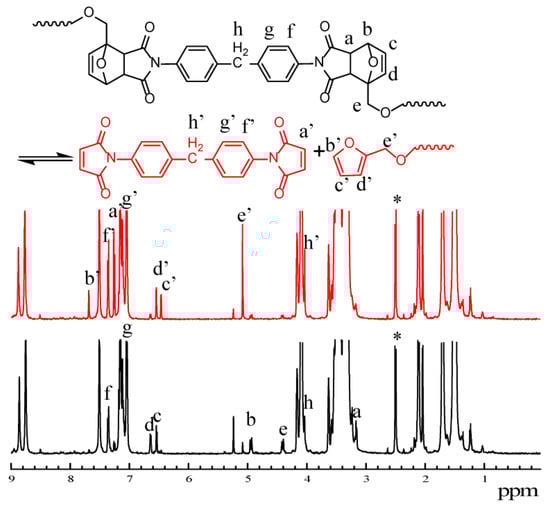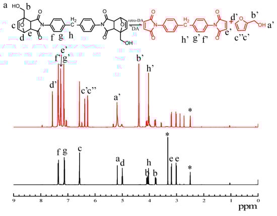 1H NMR spectra of PET-DA-PU during the heating procedure at 100 °C for 20 min. (PET-DA-PU was marked as black, and PET-DA-PU after heat treatment was marked as red, ‘*’ for DMSO-d6).