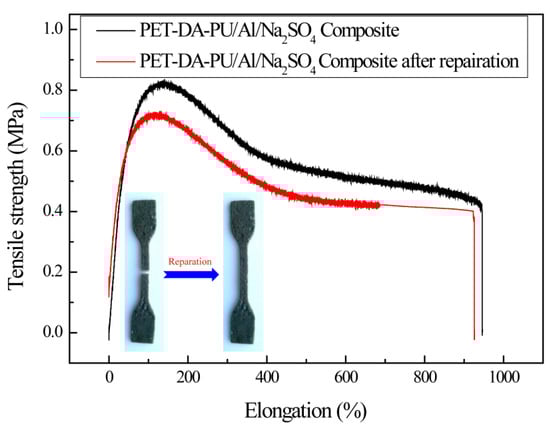 To evaluate the healing efficiency of PET-DA-PU in propellant, the PET-DA-PU/Al/Na2SO4 composite was prepared and measured by the universal testing machine. The PET-DA-PU/Al/Na2SO4 composite was prepared in a ratio of 1/0.5/0.5, and the obtained composite film was cut into dumbbell-shaped specimens and tested according to GB/T528-1998. The PET-DA-PU/Al/Na2SO4 composite film was cut off and heated at 100 °C for 20 min, then cooled down to 60 °C and kept for 48 h and the healed PET-DA-PU/Al/Na2SO4 composite films were obtained. As shown in Figure 9 and Table 1, in comparison with the PET-DA-PU/Al/Na2SO4 composite (the tensile strength was 0.82 MPa, with an elongation at 138.8%), the tensile strength of repaired PET-DA-PU/Al/Na2SO4 composite was 0.72 MPa with an elongation at 113%. Hence, the healing efficiency of PET-DA-PU/Al/Na2SO4 composite was 87.8%, which was slightly lower than PET-DA-PU. It is due to the reduction in DA bond density in composite as to the introduction of Al and Na2SO4 and decrease the healing efficiency of the PET-DA-PU/Al/Na2SO4 composite. However, the PET-DA-PU/Al/Na2SO4 composite still has a high healing efficiency exceeding 85% and exhibits outstanding self-healing performance.