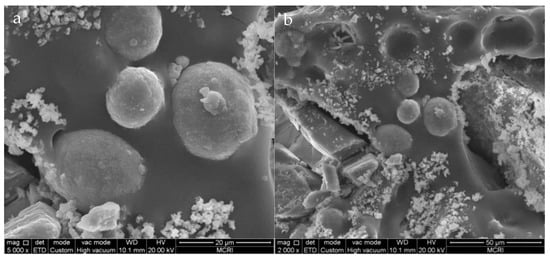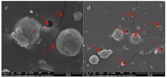 The fracture morphologies of the PET-DA-PU/Al/Na2SO4 composite which were prepared by freeze-fracturing and tensile-fracturing were also observed by SEM. As shown in Figure 10a,b, the crack surface of the composite was smooth and the interface between the exposed particles and polymeric matrix was fuzzy, meaning that the interface adhesion property between solid filler and matrix is strong. However, a number of exposed particles and cracks appeared in Figure 10c,d, and voids were found between the exposed particles and polymeric matrix, meaning that the interface adhesion property between solid fillers and PET-DA-PU matrix became poor during the tensile process []. Generally, the cracks and voids also occurred in aging stages of polymeric binder. Therefore, the PET-DA-PU polymeric binder which can repair the micro-cracks within the matrix under heat treatment could prolong its service life.