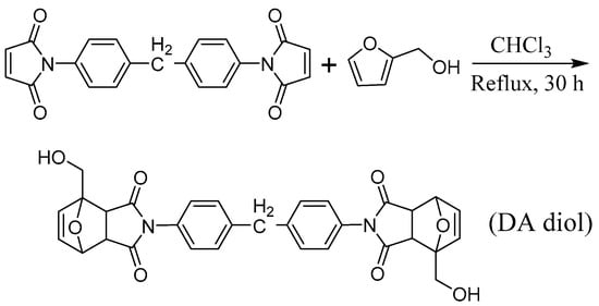 An amount of 2,2′-(methylenebis(4,1-phenylene))bis(4-(hydroxymethyl)-3a,4,7,7a-tetrahydro-1H-4,7-epoxyisoindole-1,3(2H)-dione) (DA diol) was synthesized via cycloaddition reaction using frufuryl alcohol and 1,1′-(methylenedi-1,4-phenylene) bismaleimide as the raw materials, as shown in Scheme 1. Briefly, 1,1′-(methylenedi-1,4-phenylene) bismaleimide (20 g, 55.8 mmol) was dissolved in chloroform (100 mL) in a 250 mL round-bottomed Schlenk flask with a magnetic stirring bar; the reaction solution was heated up to reflux until a uniform system, and then the freshly distilled frufruyl alcohol (11.3 g, 115.2 mmol) was added dropwise into the reaction system. The reaction was allowed to proceed for 30 h. The solution was then poured into 8 fold excess of isopropanol to precipitate the crude product. The precipitation process recrystallization in isopropanol/DMF mixed solvent three times, and the DA diol was obtained after drying under vacuum at 60 °C as a pale yellow solid (22.3 g, yield: 72%).
