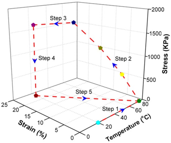 To endow SiO2/SMPU nanocomposite with shape memory effect, it was usually subjected to a typical five-step thermodynamic cycle for programming and free recovery as shown in Figure 2. The uniaxial tensile programming using a truss fixture and shape recovery were described in our previous study [17].