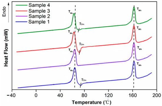 In order to be able to study the effects of programming and the addition of the SiO2 particle to the thermodynamic properties of the specimens, and to determine the Ttrans of the SiO2/SMPU composite for further discussion of its shape memory effect, the pure SMPU and SiO2/SMPU composite before and after programming were both tested by DSC. The results are shown in Figure 3.