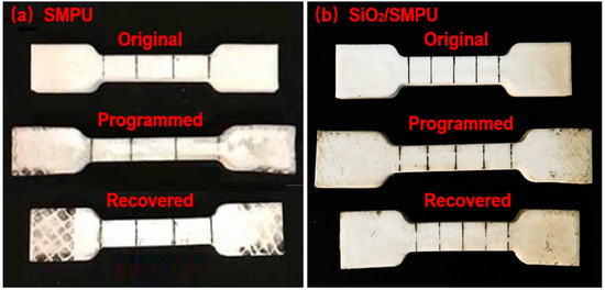 It is seen from Figure 4 and Table 1 that programmed SMPU and SiO2/SMPU specimens are elongated in the stretching direction. Then, when the temperature is raised to Ttrans °C and maintained for 30 min, the two specimens are almost restored to their original lengths after the free recovery process. This is because the elastic strain energy is prestored in the programmed SMPU and SiO2/SMPU specimens during the programming, thus providing a driving force for the thermally induced SMPU and SiO2/SMPU specimens to restore to their original shapes.