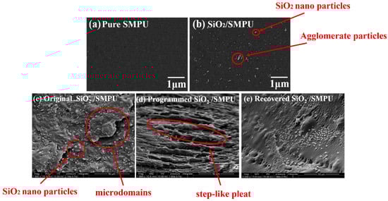 SEM images of (a) pure SMPU, (b) SiO2/SMPU, original (c), programmed (d) and recovered (e) SiO2/SMPU nanocomposites.
