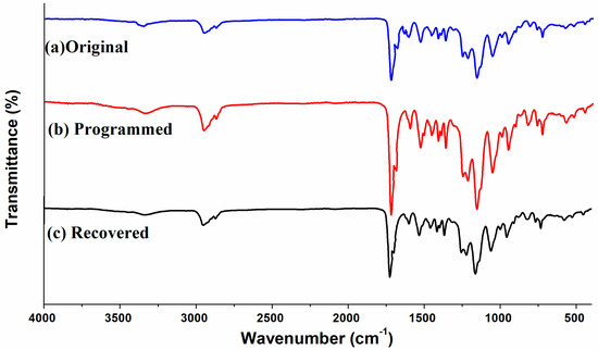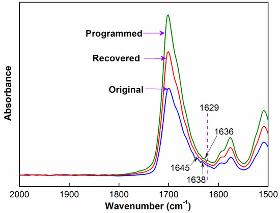 It is observed from Figure 7 that although FTIR spectra of original, programmed and recovered SiO2/SMPU samples are basically similar, the intensities of stretching vibration peaks at 1645 and 1638 cm−1 become weaker, and two new stretching vibration peaks at 1636 and 1629 cm−1 appear on FTIR spectra of programmed SiO2/SMPU sample.