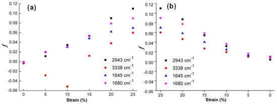 It is also seen from Figure 10a that f (3338) value is a negative and its absolute value becomes larger as the stretching strain is increased from 0% to 10%. The possible reason is that molecular chains in soft segments which wrap around N–H molecular chains are orderly rearranged along the stretching direction so that partial hydrogen bonds between molecular chains in soft segments and N–H molecular chains in hard segments are broken [51]. However, N–H molecular chains are still perpendicular to the stretching direction due to its stability, leading to the increase in f (3338) absolute value.