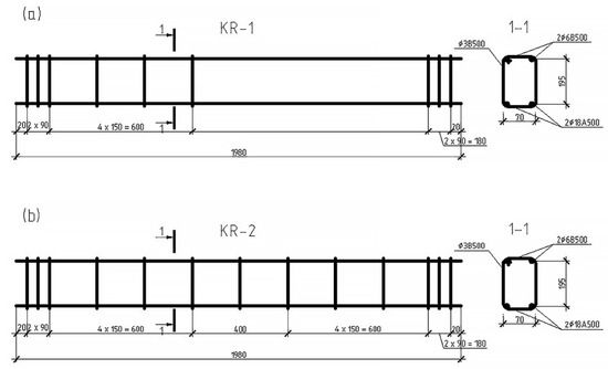 For the experiments, 22 heavy concrete beams with a design class B30, a section of 125 × 250 mm (h = 250 mm) and a length of 2.0 m were made. This concrete is now widely used in mass construction. Steel working reinforcement is represented by two rods of a periodic profile Ø18 mm, class A500. The transverse reinforcement consists of stirrups made of cold-formed wire class B500, Ø3 mm. Mounting fittings were adopted Ø6 mm, the similar class. The design of frames for reference and reinforced beams is shown in Figure 1.
