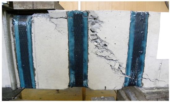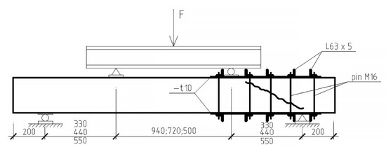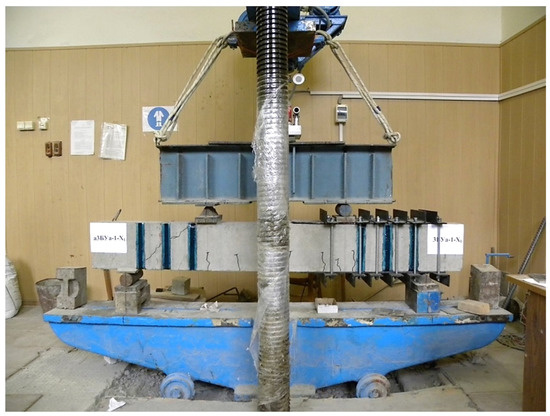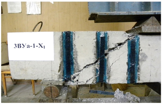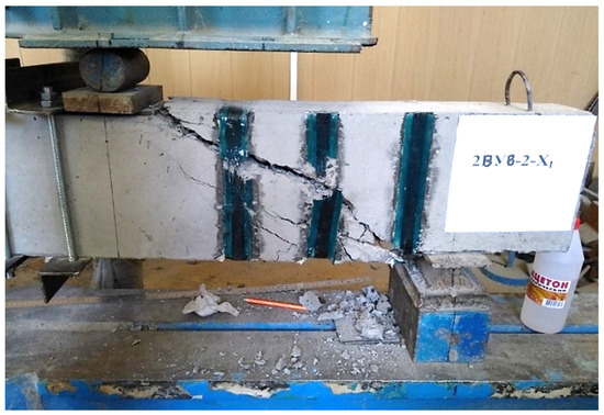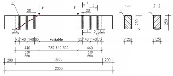 Samples reinforced with external composite reinforcement, as well as at the stage of cracking, were tested at three different shear spans—1.5 , 2 , 2.5 . The distance from the axis of the supports to the axis of application of the load for each span of the cut is 33, 44, and 55 cm, respectively.