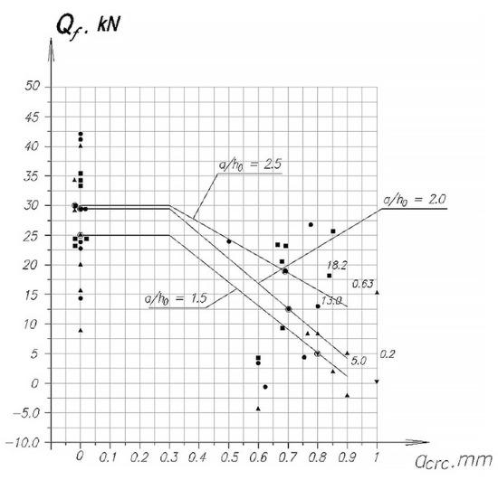 The horizontal section of this graph corresponds to the allowable width of inclined cracks = 0.3 mm, and the inclined lines correspond to the change in the value of for different shear spans with a change in the width of the initial inclined cracks. The figure shows a clear effect of the width of the opening of inclined cracks at different spans of the cut.