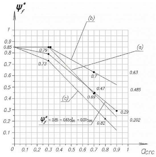 (6) Coefficient can be represented as a product of two coefficients, regulated and differentiated . The value of the coefficient , depending on the opening width of the initial inclined cracks and the size of the shear span, can be determined by the formulas: