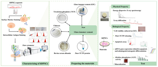 Tricalcium phosphate (TCP), especially beta-tricalcium phosphate, is a compound that has been used to enhance mineralization or osteogenesis in many biomaterials [22,23]. However, there is no study on TCP and GIC. This study developed the new material based on GIC with enhanced regenerative biological properties for being a sub-lining or lining cement for a deep cavity restoration. By using mimicked biological molecules, a recombinant Penaeus merguiensis TCTP (Pmer-TCTP) was produced to use in this study. This protein comprised 168 amino acid residues, and the molecular mass was 19.2 kDa from Penaeus merguiensis shrimp [24]. This new glass ionomer powder was modified with added chitosan and albumin for increasing the release of Pmer-TCTP of the cement [25]. TCP was also added to the powder in order to activate cell differentiation and mineralization. The hypothesis of the study is that this modified GIC has better biocompatibility and higher mineralization capability than GIC, while the chemical structures are not much different. The objectives of this study were to investigate some chemical structures of the modified GICs and compare in vitro long-term effects of these specimens on dental pulp stem cells.