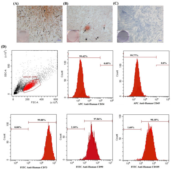 Isolation, morphological observation and flow cytometry analysis of hDPSCs. (A) Mineralized deposits identified by Alizarin Red staining in cells grown in osteogenic medium. (B) Adipogenic-induced cells were stained with Oil Red O. (C) Colony-forming fibroblastic units (CFU-F). (D) Histograms from flow cytometry analysis of cell surface markers. The hematopoietic marker, CD34 and CD45 positive are less than 20%. The MSC markers, CD73, CD 90, and CD105 positive are more than 80%.