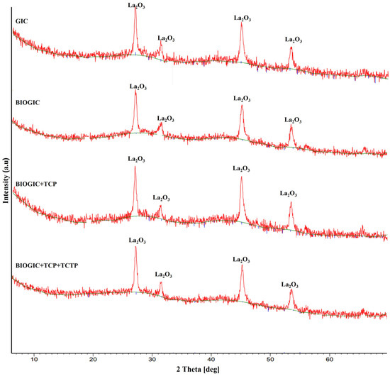 X-ray diffraction (XRD) patterns of GIC, BIOGIC, BIOGIC + TCP, and BIOGIC + TCP + TCTP.