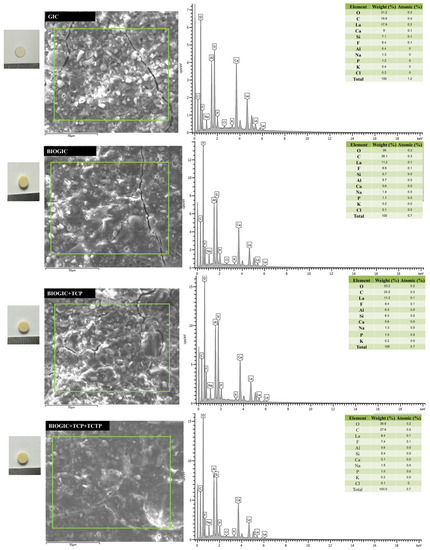 The SEM-EDX spectra of different GICs are presented in Figure 5. All specimens presented similar patterns and sharp peaks of typical GIC. Elemental analysis showed that La, Si, and Al are the main inorganic components, which were lower in BIOGIC groups and replaced by the increase in O and C that came from the compositions of chitosan and protein.