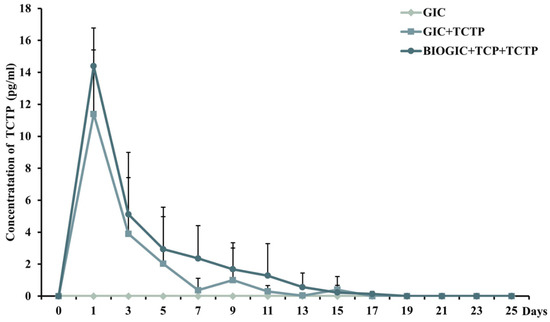 ELISA assay determined concentration of TCTP. TCTP was released from GIC and BIOGIC with added TCTP on day 1 to day 25.