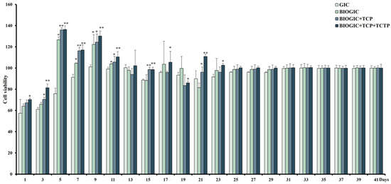 Long-term in vitro effect of different GICs on hDPSC viability. Results of MTT assay of cells cultured with different groups of GICs for 24 h to 41 days using transwell system. Data are represented as mean ± SD of cell populations. Value significant difference at * p < 0.05 and ** p < 0.01 compared to the GIC group (n = 6 in each group).