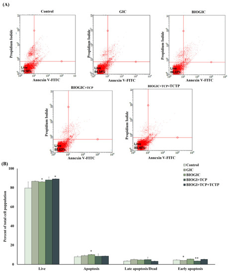 Flow cytometry was performed to analyze hDPSC apoptosis after being cultured onto different types of GICs for 24 h (see Figure 8). Cells cultured with medium only were set as control. The percentage of cell apoptosis (positive to PI and annexin-V) in the GIC group was significantly (p < 0.05) higher than other groups. The percentages of early apoptosis (positive to annexin-V only) in BIOGIC + TCP + TCTP and GIC were significantly higher than other groups. However, there was no significant difference between the percentages of living cells in all groups, which were 80%. These results indicated that none of the specimens had high cytotoxicity that caused cell apoptosis.