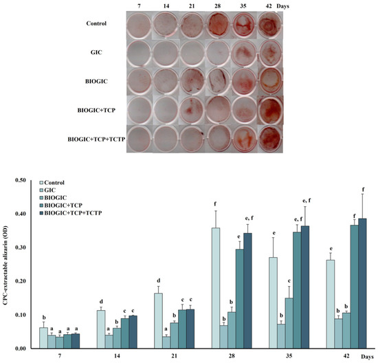 The results of the calcium deposition (see Figure 10) show that BIOGIC + TCP and BIOGIC + TCP + TCTP had significantly (p < 0.01) higher calcium content compared to GIC after being cultured for 14 days. In addition, the BIOGIC + TCP + TCTP group, after being cultured for 42 days, was significantly (p < 0.01) higher than other groups including the control. Cells being cultured on GIC had lower calcium content compared to the other groups. It was noticed that the control group, which features hDPSCs cultured with osteogenic medium without any specimen, had the highest calcium deposition than other groups at the same time period on day 7, 14, and 21 and it reached the highest calcium deposition on day 28.