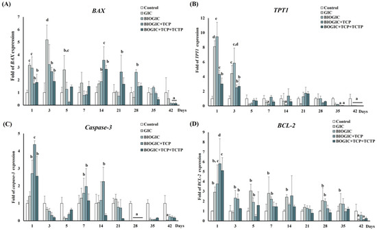 The quantification of mRNA gene expression related to cell apoptosis in hDPSCs cultured on each type of GIC for 1, 3, 5, 7, 14, 21, 28, 35, and 42 days was determined by qRT-PCR. (A) BCL2-associated X (BAX), (B) tumor protein translationally controlled 1 (TPT1), (C) (Caspase-3), and (D) B-cell lymphoma 2 (BCL-2). Data are represented as mean ± standard deviation (SD) of cell populations. Different lowercase letters represent significant difference between different groups within each time period at p < 0.05, one-way ANOVA with Tukey multiple comparison test (n = 4 in each group).