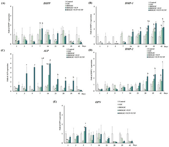 The quantification of the mRNA gene expression related to odontogenic/osteogenic differentiation in hDPSCs cultured on each type of GIC for 1, 3, 5, 7, 14, 21, 28, 35, and 42 days. (A) Dentin sialo phosphoprotein (DSPP), (B) dentin matrix protein 1 (DMP-1), (C) alkaline phosphatase (ALP), and (D) bone morphogenetic protein-2 (BMP-2), and (E) osteopontin (OPN). Data are represented as mean ± standard deviation (SD) of cell populations. Different lowercase letters represent significant difference at p < 0.05 (n = 4) between different groups within each time period (one-way ANOVA with Tukey multiple comparison test).