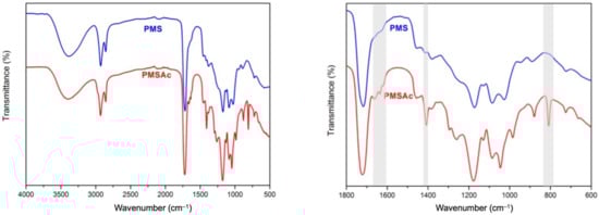 Right side: complete ATR–FTIR spectra of the PMS and PMSAc. Left side: magnified view of the 1800—600 cm−1 region.