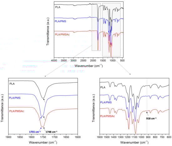 The introduction of the PMSs slightly modified the PLA spectrum. For instance, changes in the stretching vibration of the C=O group were observed, showing the presence of a new band at 1755 cm−1, associated with the incorporation of the PMS and PMSAc (Figure 2). Additionally, a new band appeared at 918 cm−1, as highlighted in the figure, which can be associated with the development of a crystalline structure, in particular an α-form, due to the incorporation of the PMS and PMSAc. This result was also confirmed by XRD, and it is further explained below.
