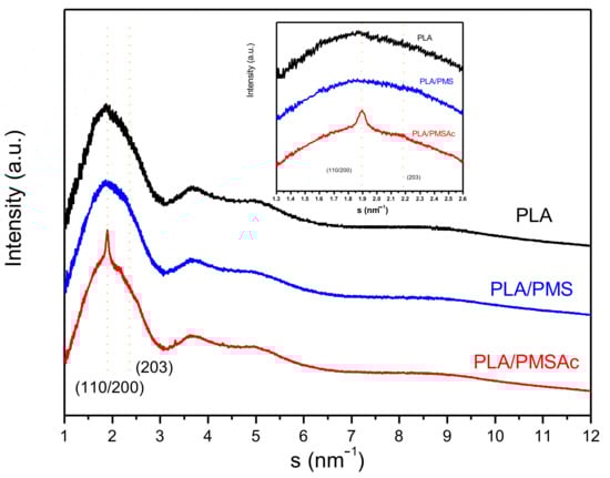 The α form of the PLA, a pseudo-orthorhombic structure with each unit cell containing two 103 helical chains, presented a similar chain conformation to the α′ form, but, in this case, it was more disordered. In the pattern, we can distinguish a clear reflection at 1.86 nm−1 (110/200) and diffuse (203) at 2.12 nm−1, which can be attributed to both forms. The α-form is obtained by isothermal crystallization above 120 °C or by stretching a solution-spun PLA fiber at relatively low drawing temperatures and/or low hot-draw ratios [30]. The α′-form crystals are developed by melt or cold crystallization at lower temperatures (below 100 °C), and a mixture of α- and α’-form crystals is formed in the intermediate temperature region between 100 and 120 °C [31,32]. The diffraction profiles of α and α′ forms are quite different at q values of >15 nm−1 [33,34]. In the present work, the crystalline fractions did not allow us to distinguish between forms.
