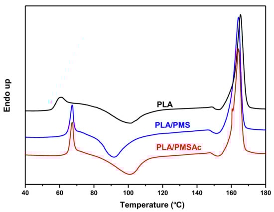 Our analysis revealed similar characteristic parameters as those reported in the literature [35,36,37,38]. The incorporation of the PMS and PMSAc in the fibers slightly changed this behavior. The Tg values of the blends were higher than that of the neat PLA (see Table 1). This fact could be attributed to the inter- and/or intramolecular hydrogen bonding between the PLA and PMSs. The PLA/PMS fibers also began their cold crystallization at a lower temperature, as did the melting. However, although the Tm was similar, the Tcc increased up to the PLA values when the acrylated PMS was incorporated into the blend. Moreover, the estimation of the crystallinity degree by DSC clearly confirms that observed in the WAXS measurements. In addition to this, the presence of the endothermic peak close to 155 °C present in each sample is also indicative of the presence of α’ form [34].