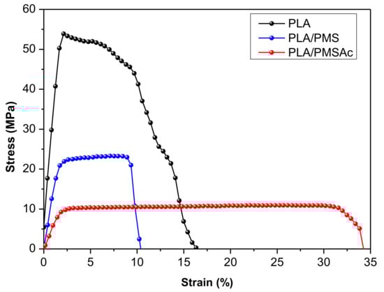 Stress–stain curves of the electrospun fibers of PLA, PLA/PMS, and PLA/PMSAc at 10 mm/min.