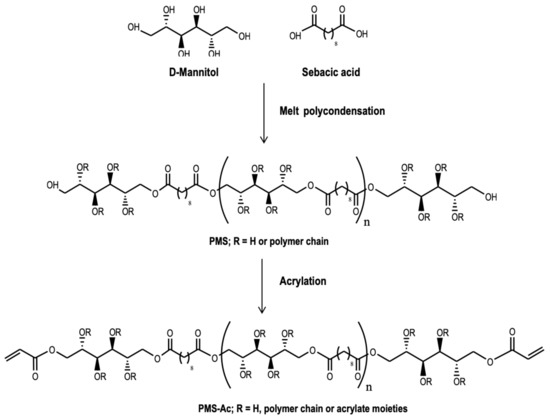 Among this family is poly(mannitol sebacate) (PMS), which is made from mannitol, a diastereomer of sorbitol (the most well-studied natural polysaccharide-derived hexitol), and sebacic acid (a natural C10 fatty acid), which is directly produced from castor oil. The main problem affecting its synthesis is the high melting point of the mannitol, as well as its low solubility in organic solvents, the reasons for which it is formed by melt polycondensation [20]. PMS has been used as an upconverting cross-linked elastomer with covalently tethered chromophores [25], but mainly it is used as a matrix in blends and nanocomposites with an increased modulus and enhanced strain and toughness [14,22,26], which are requirements for applications in surgical procedures and tissue engineering [19,20].