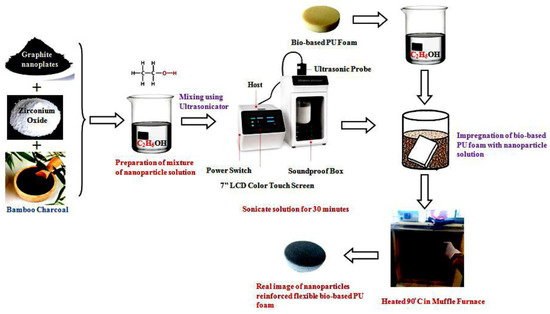 Generally, zirconium is available in the form of nanofluids and nanoparticles. Zirconium is applied to insulating and fire-retardant materials, as they can resist high temperature up to 2715 °C. Graphene in powder form exhibits optical and pyro-optical properties, which are extensively used in optical storage industries [24,25]. High ionic conductivity makes it one of the most useful in electroceramics [26,27,28]. Bamboo charcoal is produced by a carbonization process; it has excellent properties, such as high conductivity, adsorption properties, and a massive surface area. It is an environmentally functional material with unique absorption properties and has a large surface area with an efficient porous structure, making it more suitable for absorption into PU foam [29,30].