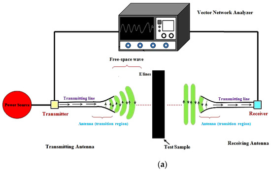 The sample was placed 30 cm from the transmitter and the receiver to keep the antenna in range. As shown in Figure 2b, the antenna and power supply were connected to a network analyzer, which provided S-parameter plots of the EMI SE of the specimen. The literature [31] and the following parameters, as stated in Equations (1)–(7), have been used to understand the experimental results of EMI SE: