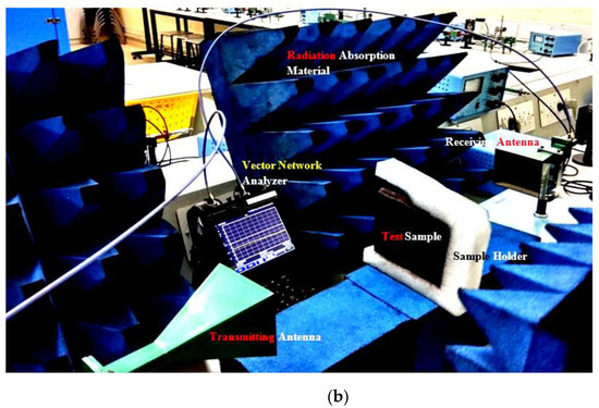 The electronic assembly’s actual shielding effectiveness is assessed using the open field or free space method. The radiated emissions that run away from the completed product are measured using this method. The EMI SE testing parameters include a typical network analyzer with model number N5230A PNA-L. It has a dynamic range of 108 dB and operates from 10 MHz–50 GHz. Waveguide measurements and OSL/TLL calibration are also available. The operational voltages for the experiments were +5 V and 15 V. Specimens were examined in the transmitter range at a frequency range of 8–12 GHz with a phase resolution of 1 degree. The length of the transmitter and receiving antennas is half a wavelength, with the feed line split precisely in the middle. The schematic illustration of the electromagnetic interference test setup is shown in Figure 2a. When the distance between the transmission source and the receiver exceeds k/2p, it is considered to be in the far-field protective district (where k is the frequency of the source and p is the 240 VAC power supply). The specimen was positioned in the center, 60 cm from the receiver and transmitter. The transmitter and receiver are linked to a vector network analyzer, which provides a plot of the EMI shielding effectiveness of the sample (see Figure 2b).
