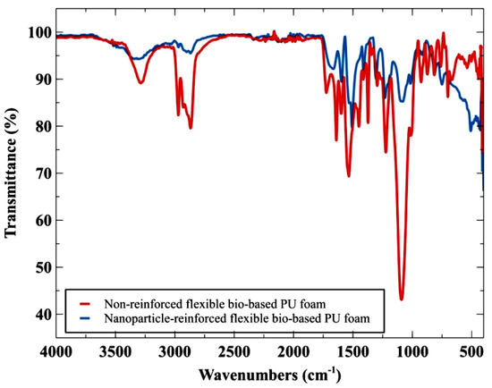 FTIR graph of non-reinforced and nanoparticle-reinforced flexible bio-based polyurethane foam.
