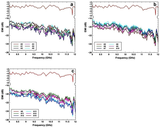Evaluation of EMI values for (a) (A0, A1–A5), (b) (A0, A6–A10) and (c) (A0, A11–A15) of different flexible bio-based polyurethane foams with and without nanoparticle.