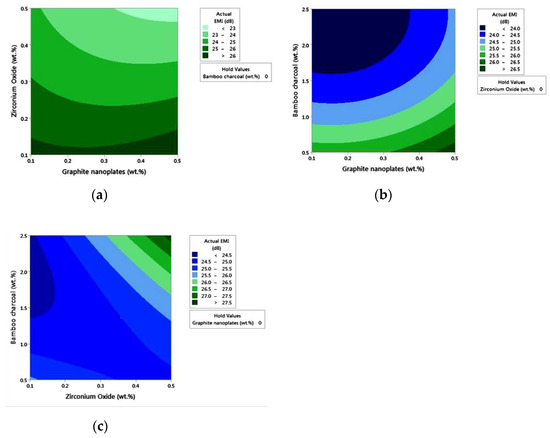 Contour plots displaying the impact of (a) GNP and ZrO2 on EMI effect, (b) GNP and BC on EMI effect, (c) BC and ZrO2 on EMI effect.